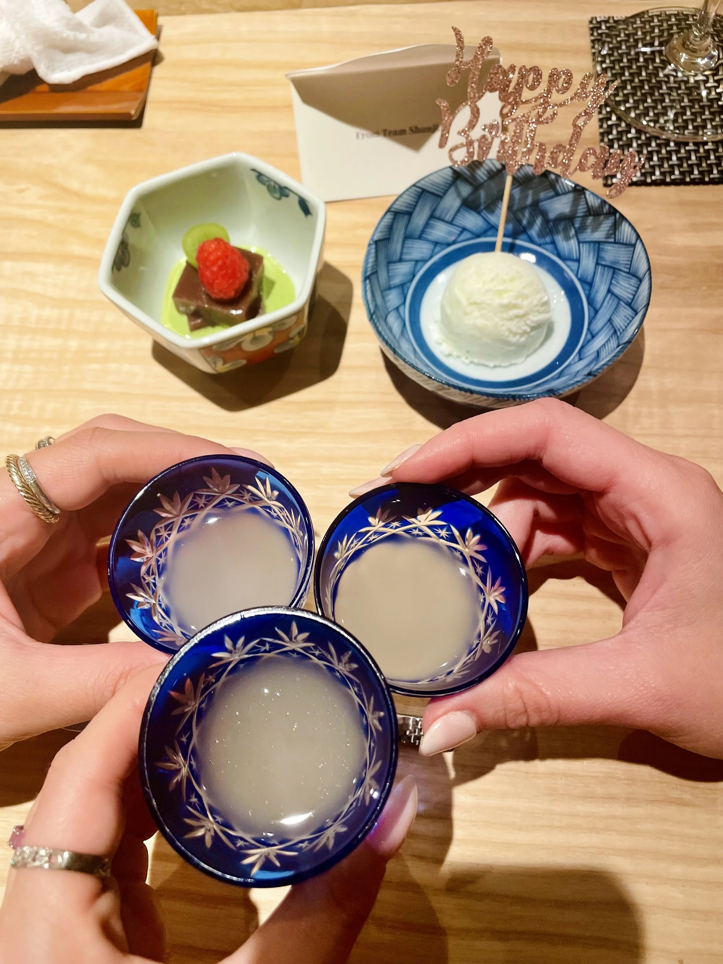 The sushi pieces were prepared with rice soaked in red vinegar, which gave them a delicious and unique taste profile in comparison to other sushi establishments I have tried. My favorite would probably have to be the barracuda sushi, which was very rich and bursting with flavor. I loved that there were many pieces and dishes we had never eaten before — I was proud of my friends and I for being adventurous and trying out each one! The Happy Birthday dessert came with a card that was signed by every single person who works at Shunji, which was so special. We ended with a final glass of dessert sake in gorgeous matching blue Edo Kiriko glasses which was the cherry on top to a perfect evening.
