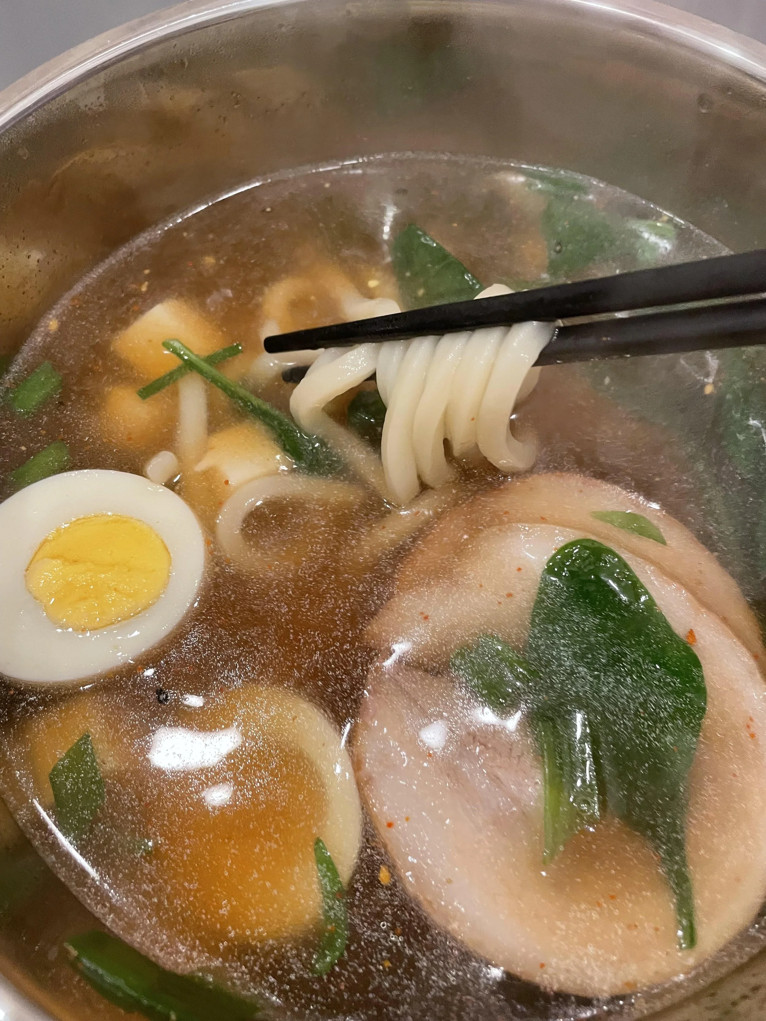 Bring 2 cups of water to a boil, add 1 tsp of dashi, 1 tbsp of soy sauce, 1 tbsp mirin, 1/2 tsp of sugar (low sugar version). Add in frozen chashi (2 pieces), egg, green onions, tofu, and any other add-ins. Cook for 3 minutes. Pour broth over udon noodles and top with chili pepper. Enjoy!