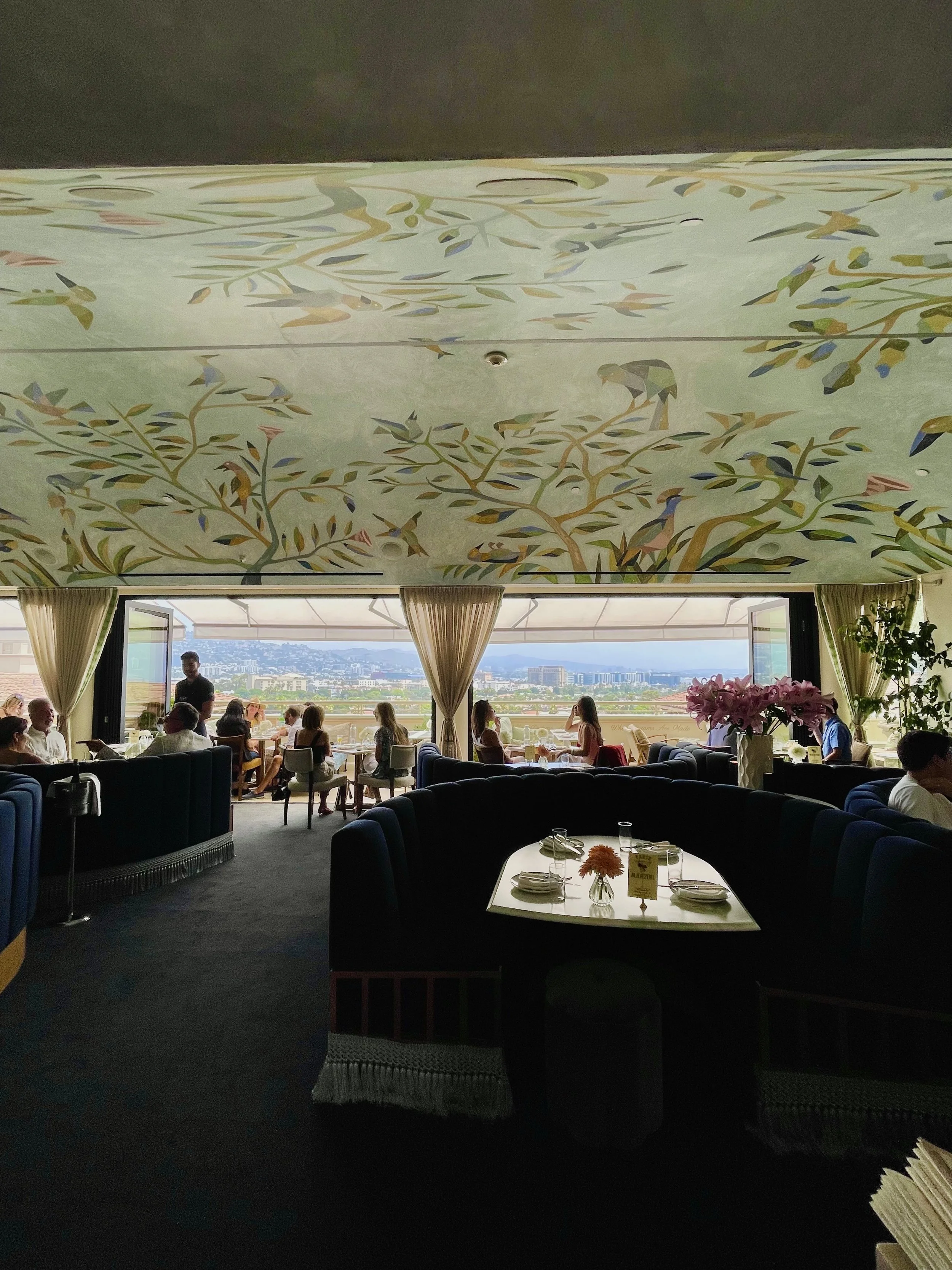 We rode the elevator up to the 9th floor, and gasped as we saw a straight shot of the view. I want to emphasize what an amazing job the Dante team did in avoiding creating a copycat of the New York locations, and instead curating a stunning space that reflects the Los Angeles lifestyle. I love every design choice that was made — from the blue rounded velvet booths, ceiling art, flower arrangements and greenery, and even a gorgeous white piano. It was our lucky day as we were seated on the patio, and got to look out at the view while sipping on our delicious cocktails.